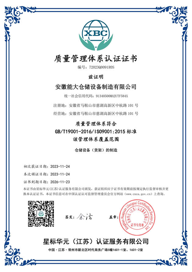 能大倉儲貨架質(zhì)量管理體系認(rèn)證證書