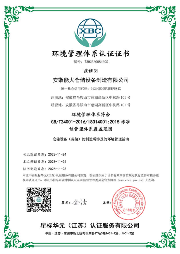 能大倉儲貨架環(huán)境管理體系認(rèn)證證書